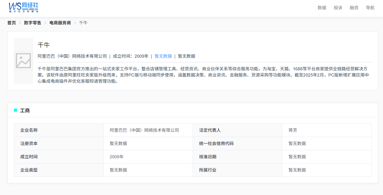据网经社企业库显示,“千牛”属于阿里巴巴(中国)网络技术有限公司,成立于2009年,法定代表人是蒋芳。