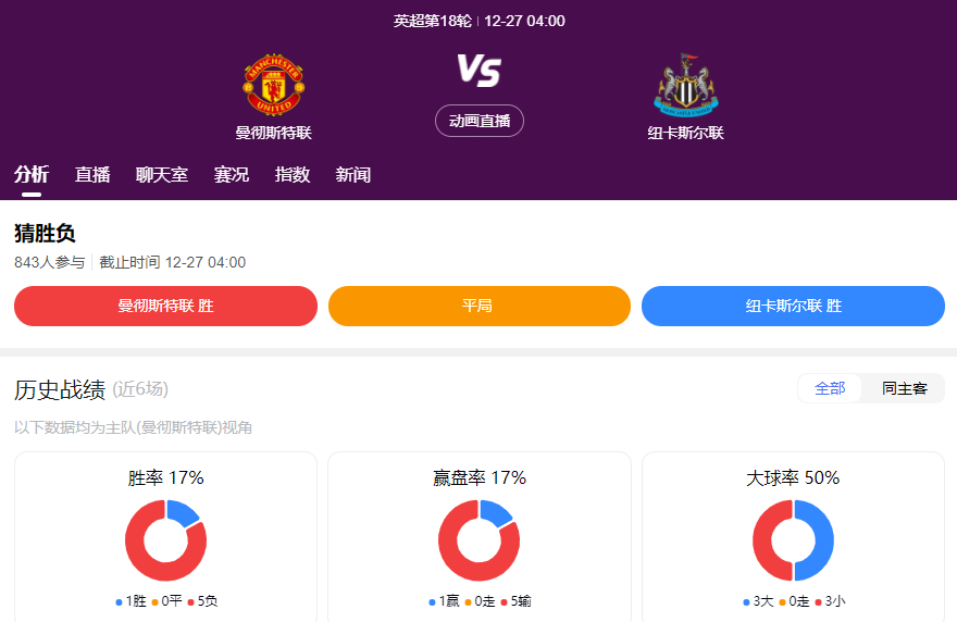 北京时间12月27日4点,英超第18轮,曼联对阵纽卡。