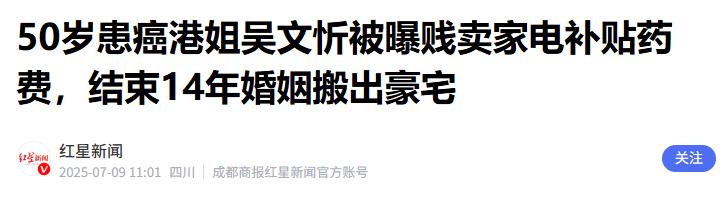 红星新闻 2025-07-09——50岁患癌港姐吴文忻被曝贱卖家电补贴药费,结束14年婚姻搬出豪宅