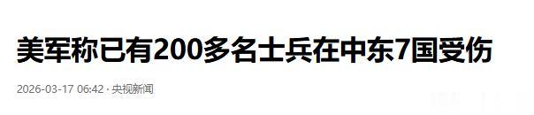 “也门胡塞武装不费一兵一卒,美军航母自残了!”央视新闻的报道,据美国方面2026年3月16日消息,美国海军福特号航母12日发生的火灾持续超过30小时,600多人因火灾失去床铺,只能睡在桌子或地板上。航母上有2人因火灾造成的“非致命伤”接受治疗,数十人报告吸入火灾烟雾。当地时间3月16日,美国中央司令部发言人蒂姆·霍金斯表示,自美国和以色列本轮对伊朗发动军事行动以来,已有超过200名美军士兵在7个中东国家受伤,美军受重伤的士兵已增至10人,已有13名美军人员在对伊朗军事行动中死亡。