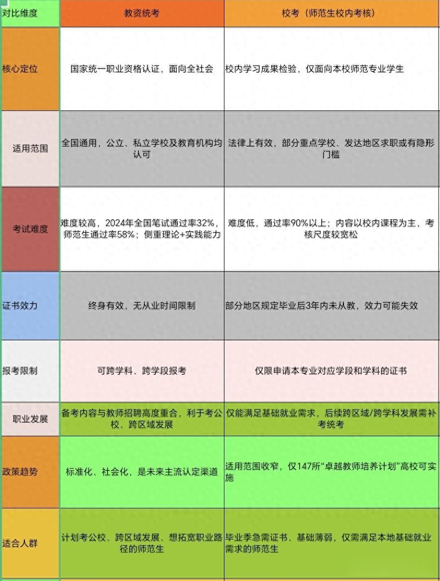 从长远来看,统考会成为教师资格认定的唯一主流渠道。现在选择校考,可能暂时省力,但未来若想跨区域发展、转行教其他学科,或报考要求更高的岗位,大概率还是要回头补考统考,反而浪费时间。