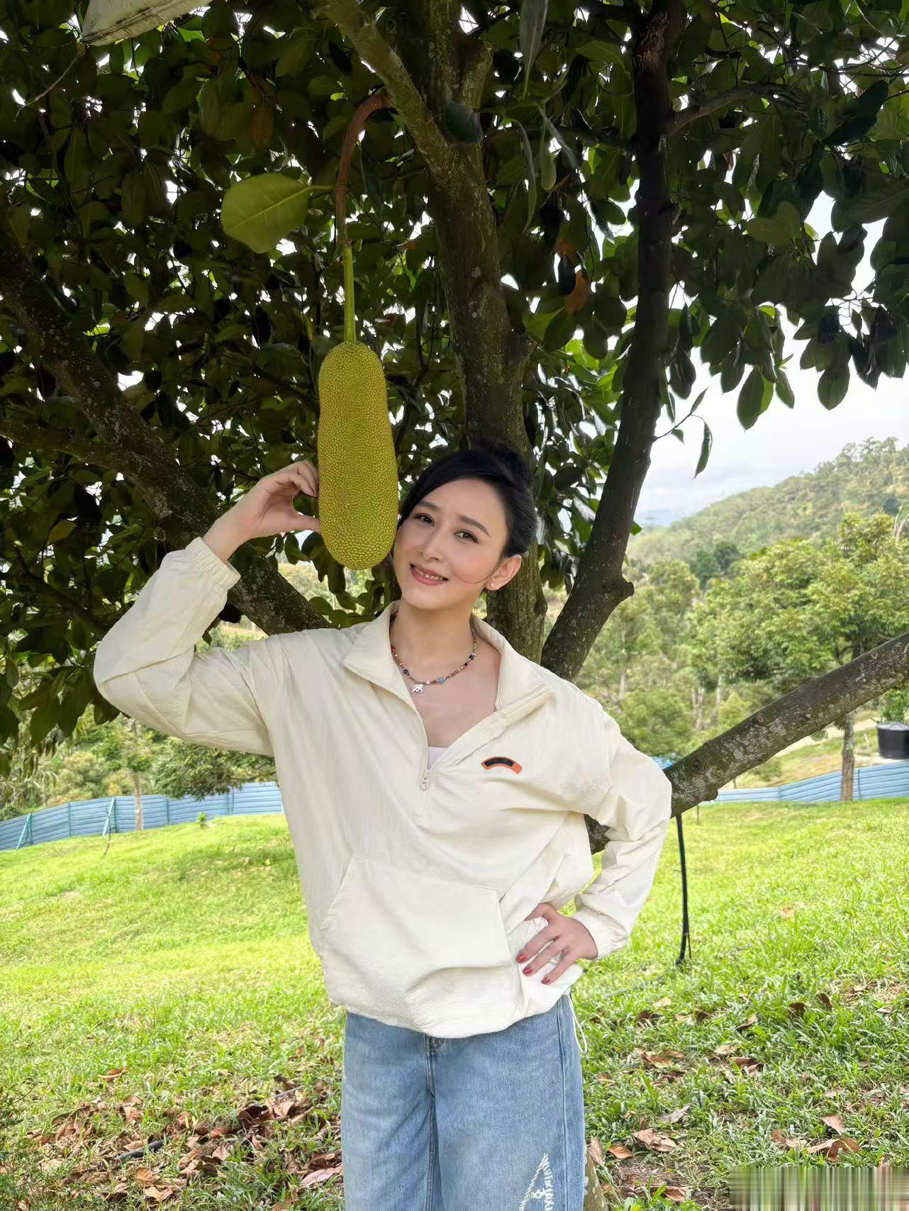 胡静站在菠萝蜜果树下和果子合影,富婆的生活真是让人羡慕,人比水果还好看。