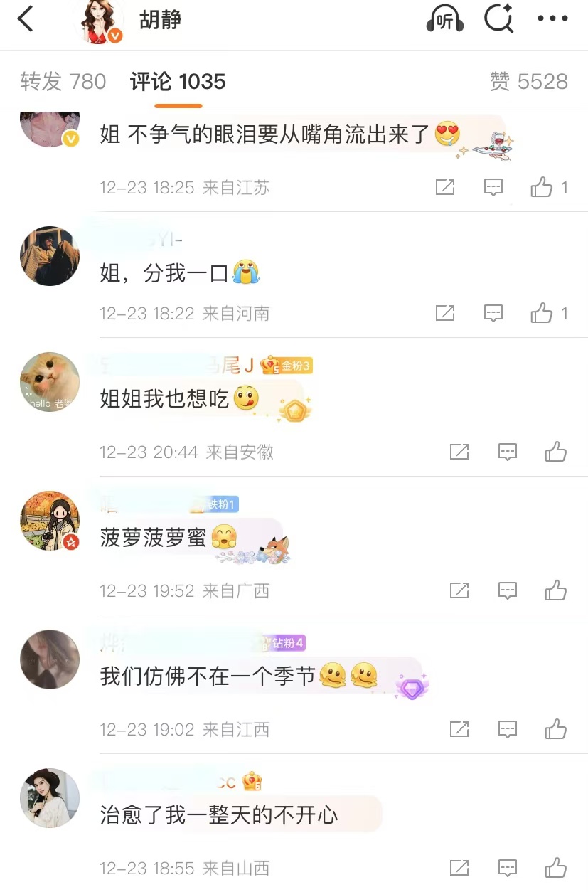 很多网友说看到这些猫山王口水都忍不住从嘴角流出来了,大家都在喊话胡静分自己一口。我们的冬天仿佛跟胡静的不是同一个季节,这是网友的真实感受。