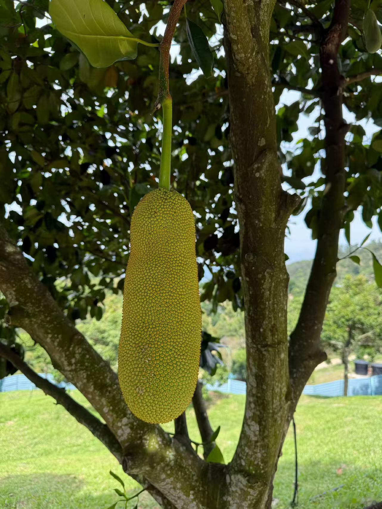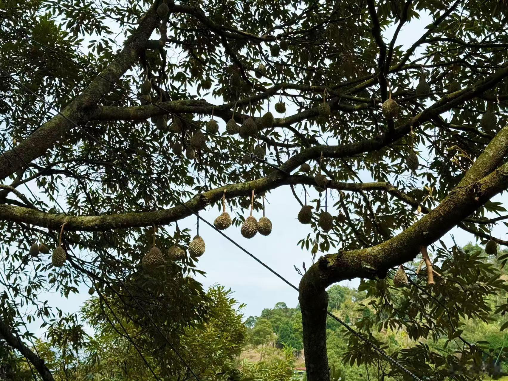 胡静家的榴莲园,随便一棵榴莲老树都比我年龄大。树上的榴莲挂满枝,几百块钱一个榴莲,这满树全是白花花的金钱味道呀!不敢想象胡静有多幸福,每天都可以在家自给自足,真实的榴莲自由。