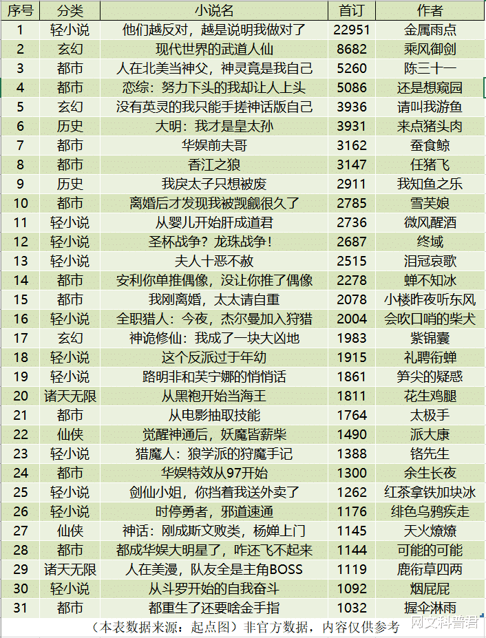 本周起点上架小说302本,其中首订过千小说31本,其中首订过万小说一本。这周上架的书很多,但大部分都是一两千的首订,真正的爆款就《他们越反对,越是说明我做对了》这本书。