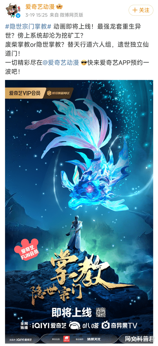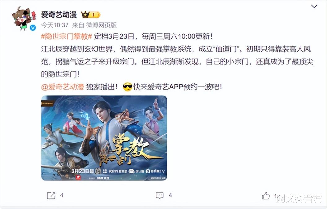 七、网文改编动画《当隐世宗门掌教》预计4月初上线3月21号,爱奇艺动漫发布了由九库文学网的《我靠装.逼,当隐世宗门掌教》改编的动漫《隐世宗门掌教》即将在本月23号定档上线,每周三周六更新。