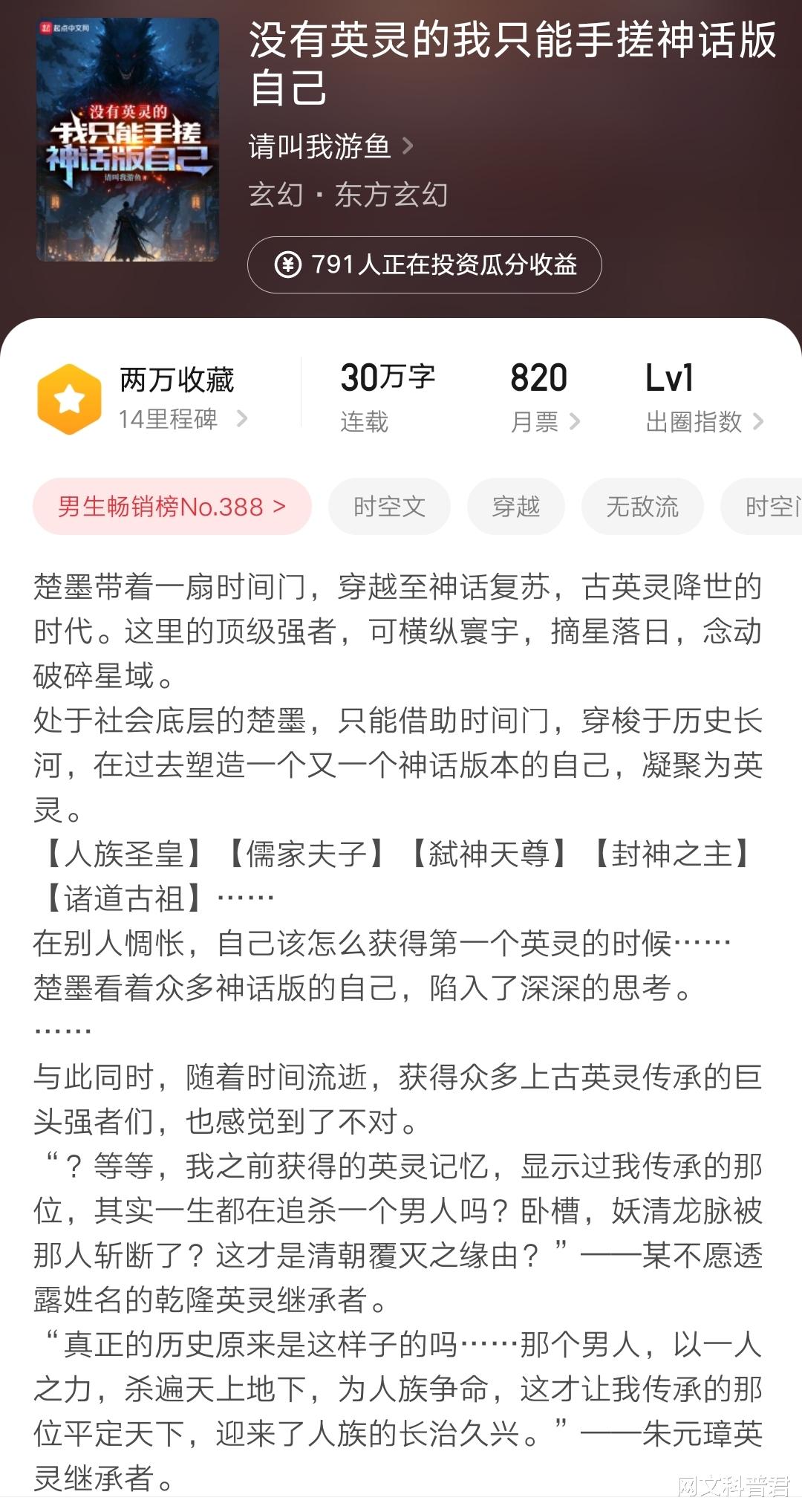 第三本《没有英灵的我只能手搓神话版自己》,三千多的首订,作者是起点四级作家请叫我游鱼,也是写过两本书的老作者了。这本书讲了主角穿越后直接觉醒为时间门户之主,能够让意识穿梭历史,改变过去,相当bug的一个技能,开局主角就因为穿越遇到妖魔于是开启了时空之门遁走,之后打造属于自己的神话。