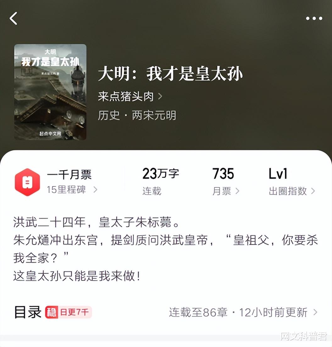 《大明:我才是皇太孙》,首订成绩三千的历史文,作者是起点一级作家来点猪头肉,写过一本体育竞技文。这本书讲的是主角穿越成为朱元璋的皇孙朱允熥,开局提剑冒进皇宫去抗议朱元璋立朱允炆,即他的亲二哥为太子,并且提出应该立自己为太子。