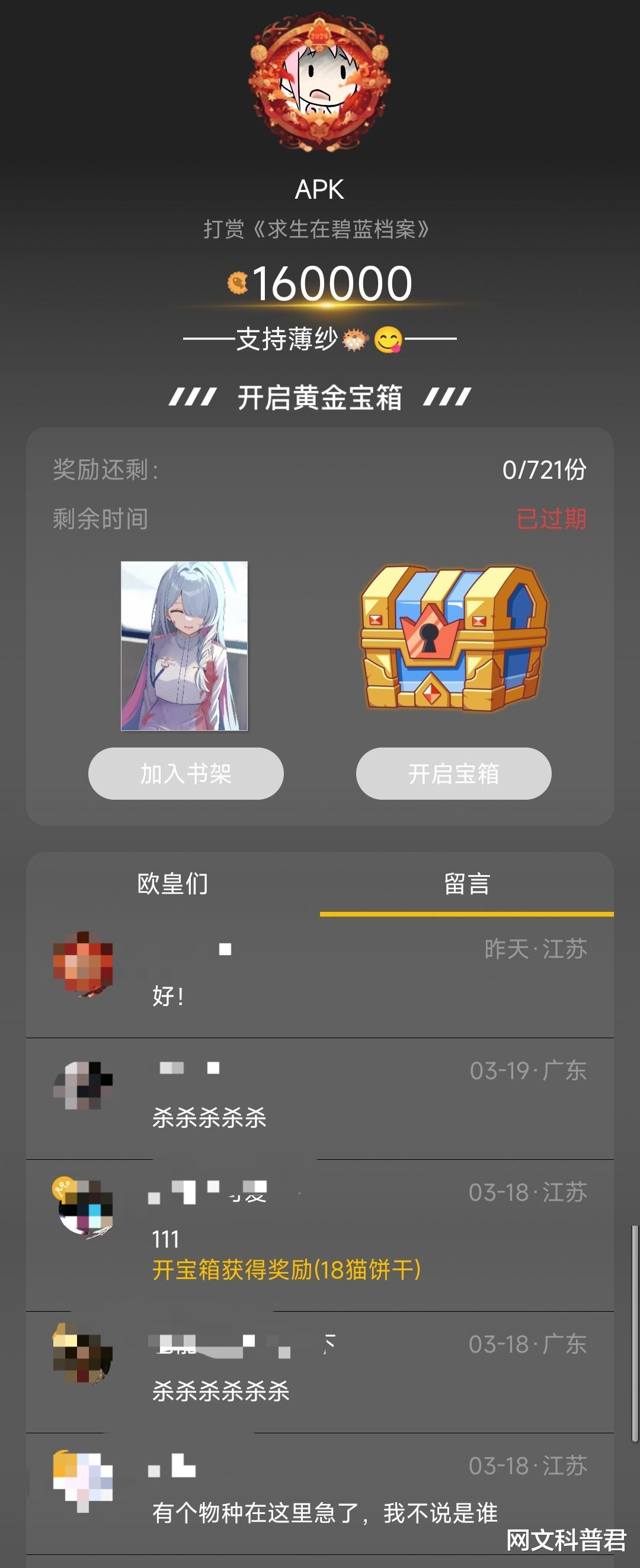 20日,作者发单章声明被短信轰炸,否认这是营销并称已报jing。说实话,我也不太认为这是营销,毕竟这本书成绩确实不错,现在应该是有万订成绩的,算是刺猬猫碧蓝档案同人文里成绩最好的一本了。