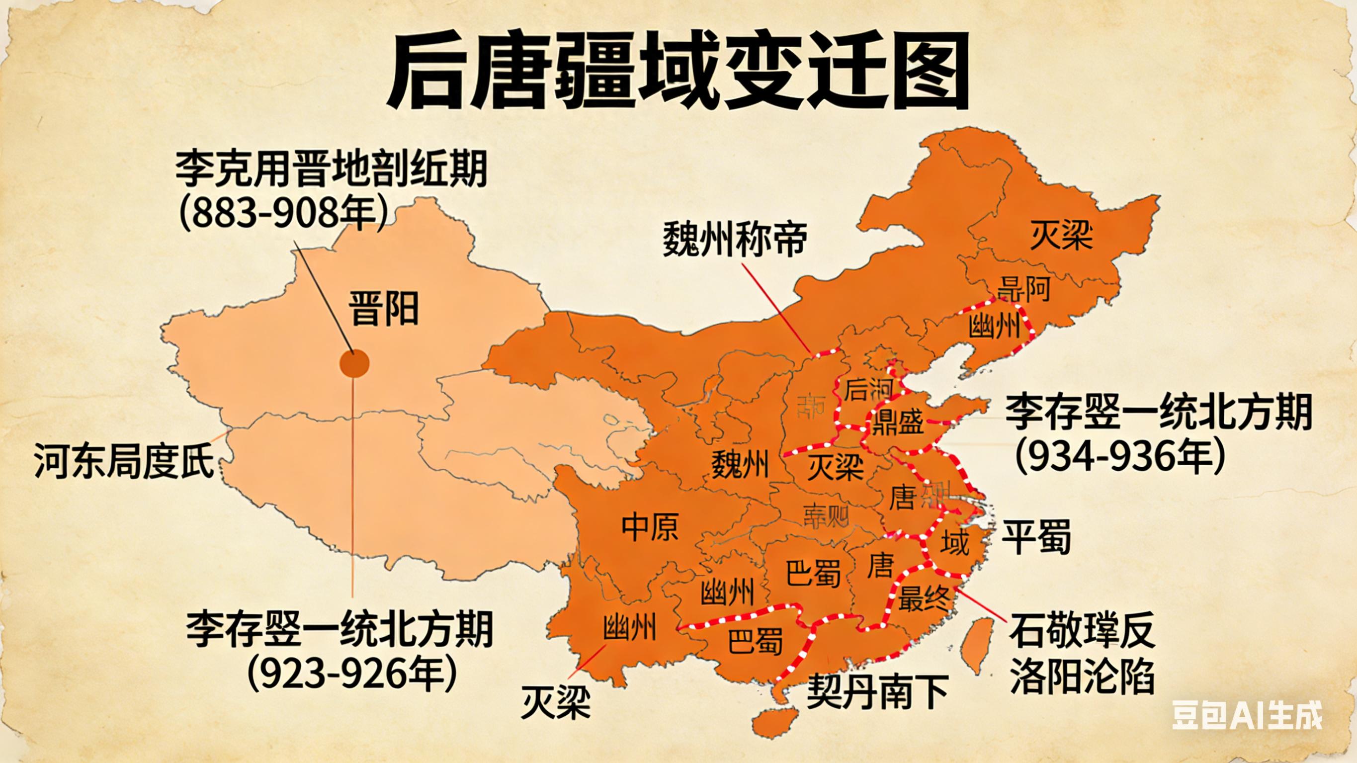 灭梁之后,李存勖继续南征北战,派大将郭崇韬率军西征,灭掉前蜀,尽收蜀地千里沃土;此时的后唐,疆域东至大海,西抵巴蜀,北达幽燕,南控荆襄,成为五代十国以来疆域最辽阔的政权,南方诸国纷纷遣使称臣,统一中原近在咫尺。