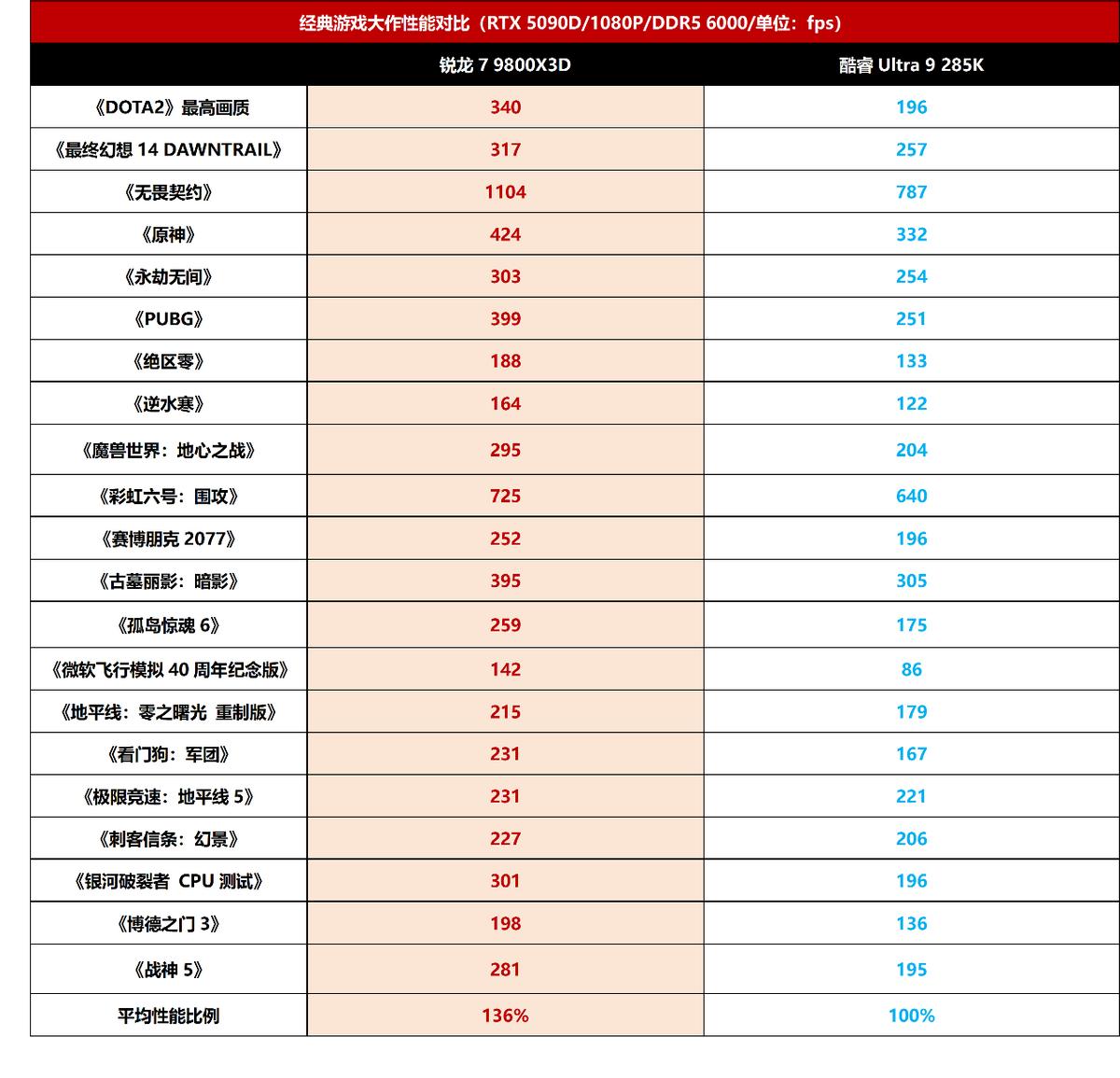 与具备20个核心且最高睿频频率达到5.5GHz的酷睿Ultra 7 265K相比,6核的锐龙5 9600X在先进架构、更大三级缓存、更低内存延迟的加持下,在测试的11款游戏中,除了《全面战争:战锤3》中两款CPU打成平手之外,其余10款游戏,锐龙5 9600X在《战争雷霆》中的领先幅度最大,达到了48%,平均领先幅度达到了7%,优势非常明显。完全可以说,6核的锐龙5 9600X游戏性能比2000元价位的20核酷睿Ultra 7 265K更强,大家完全不用担心性能不够的问题。