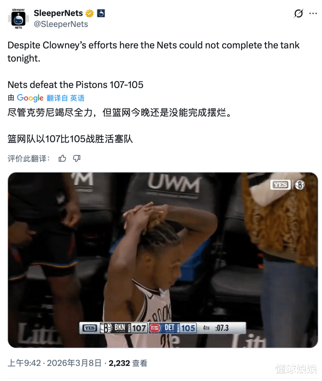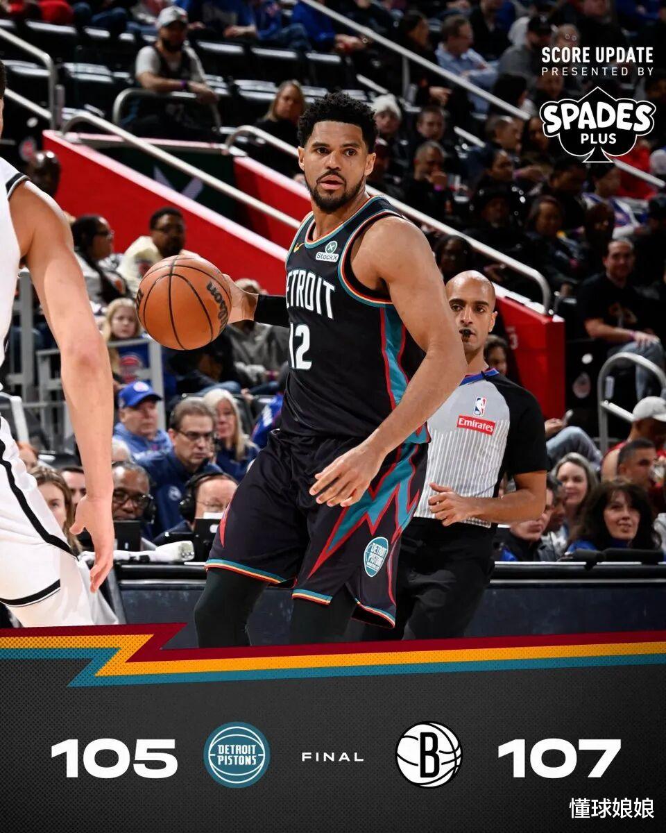 不过话说,活塞啊,就算今天你们没有坎宁安,没有奥萨尔-汤普森,但是输给篮网会不会也有点太难看了?就这两个关键球执行得乱七八糟的……第一个