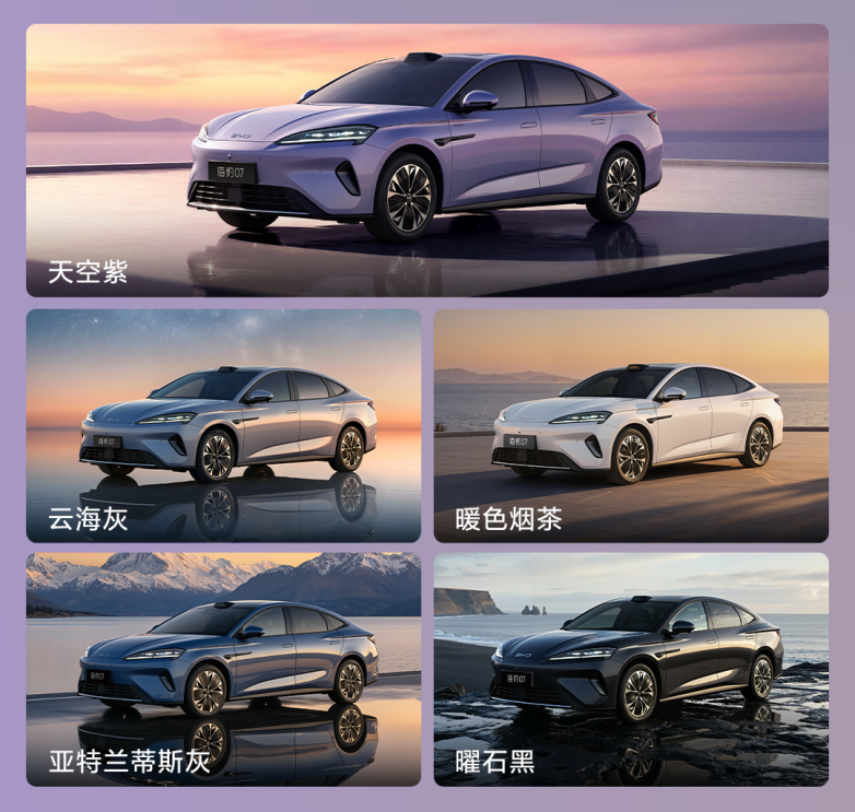 海豹07EV沿袭海洋美学设计,提供天空紫、云海灰、暖色烟茶、曜石黑、亚特兰蒂斯灰5款外观配色,让每一次出行都成为路上流动的风景。