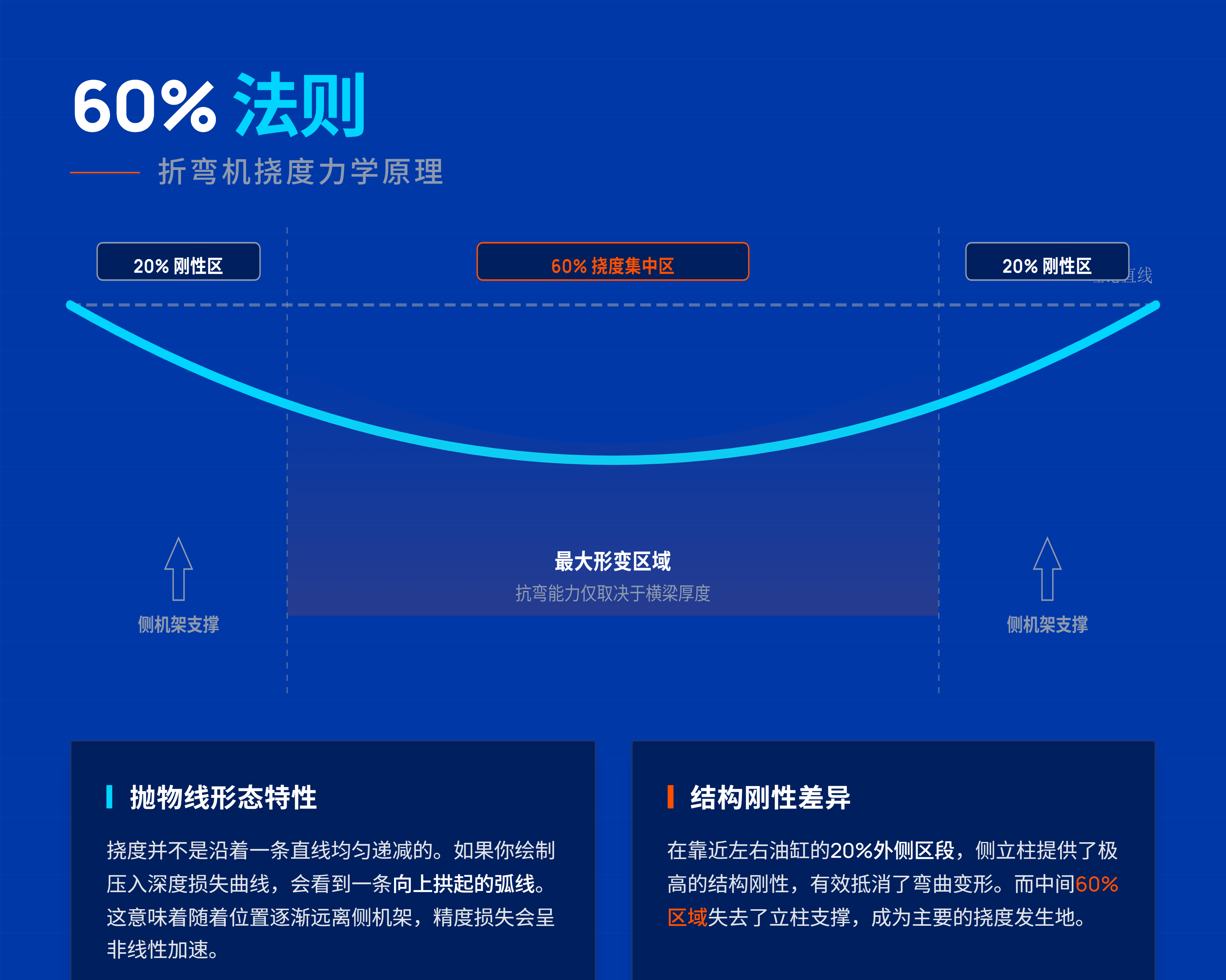根据偏转力学中的“60%法则”,大部分与目标角度的偏差发生在两侧机架之间跨度的中央60%区域内。靠近每个油缸的外侧20%区域——即左右两端——受益于侧立柱的结构刚性,能有效抵抗弯曲。