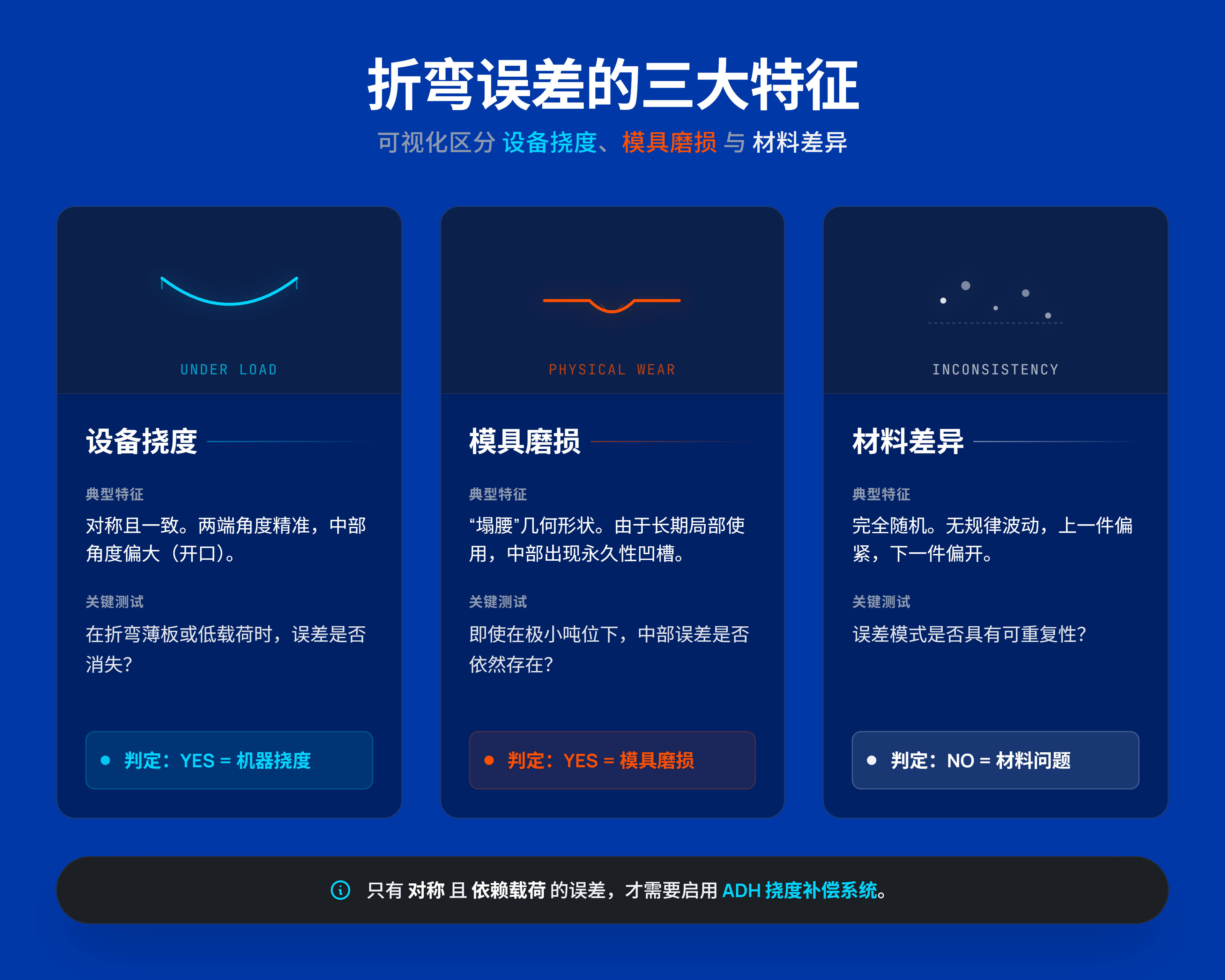 在安装挠度补偿系统或开始任何模具垫片调整之前,你需要确认偏转确实是问题的根源。“中心疲软”可能源于三个不同的问题:机床偏转、模具磨损或材料不一致。