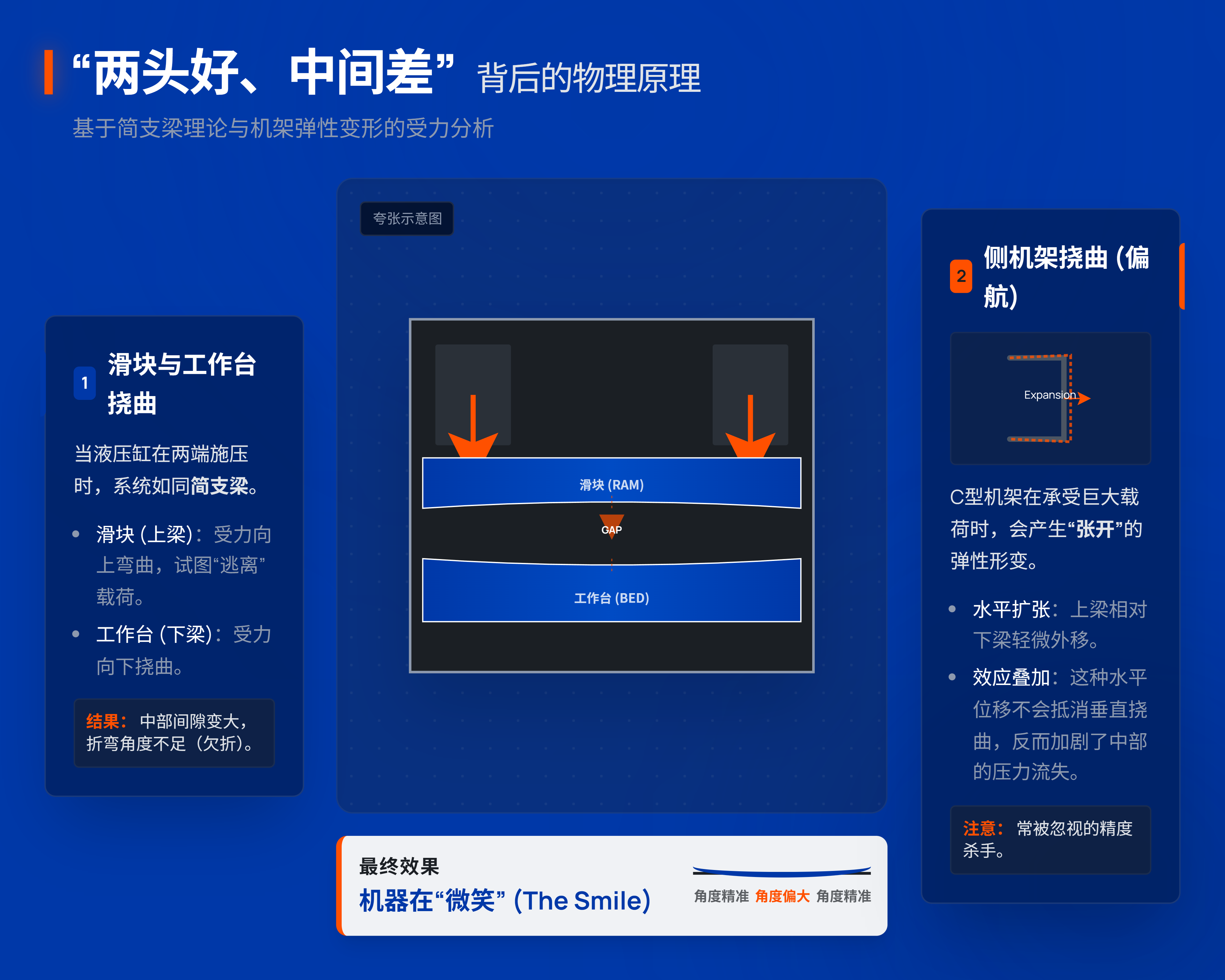 当两端的液压缸推动滑块向下压向工件时,整个系统的受力行为非常类似于一个简支梁。压力施加在两端,而阻力则分布在整个长度上。因此,两种类型的变形会同时发生: