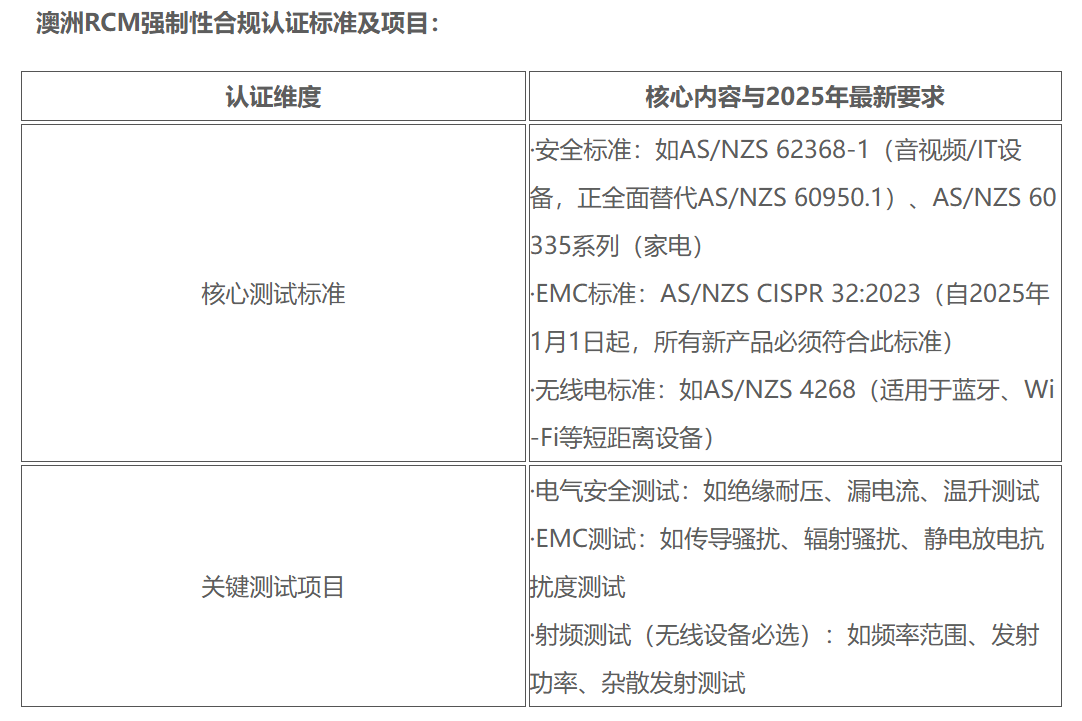 RCM 标志需符合 AS/NZS 4417 标准:尺寸≥3mm,必须标注产品注册编号,标签不合规是退运的主要原因之一;