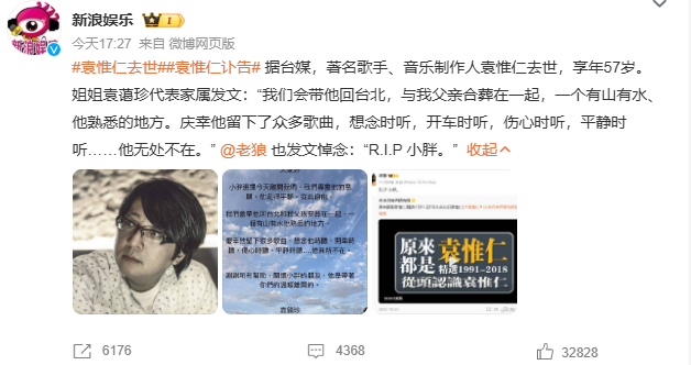 2月2日,袁惟仁终究没能熬过病痛的折磨,平静离世。家属在悼文中温柔写道:“小胖选择今天离开我们,我们尊重他的意愿,他走得平静,从此自由”,并表示会带他回台北,与父亲合葬在一处有山有水、他熟悉又安心的地方,让他落叶归根。
