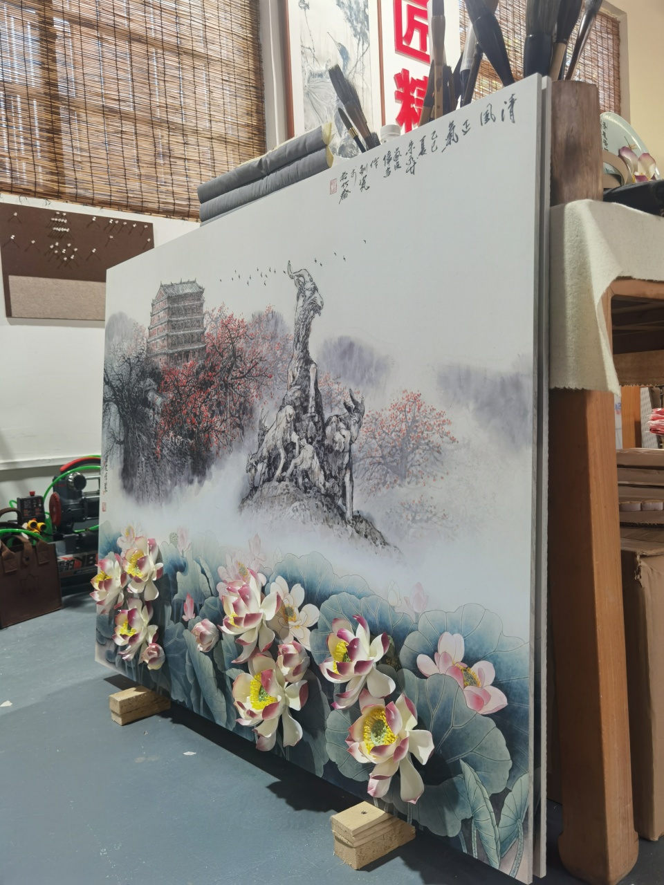 更有独特意义的是,荷花瓷在烧制中虔诚融入伏羲庙会香灰——这已超越单纯材料,成为承载祖先信仰、文化哲思与民族团结的文明信物。泥土、香火与火焰,将文化习俗与神圣记忆永恒凝结。著名山水画家、江西美术院原院长、江西雕塑院原院长詹艺,则从实践角度高度评价了其技术成就:“陶瓷的材质特性、国画的笔墨意境、雕塑的空间体积,三者各有其独特语言,能在一幅作品中和谐相融,已属不易。更关键的是,平面瓷板作为基底,与塑造娇嫩轻薄立体花瓣所需的工艺截然不同,涉及高低温釉料的转换和复杂的釉变温度控制,其烧制难度之大,非深厚经验与精湛技艺不能驾驭。”詹艺的评论,精准点破了《清风正气》在技术层面的高度。