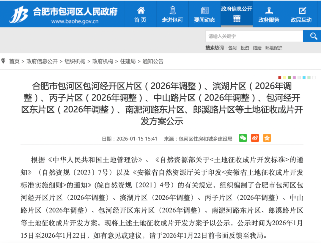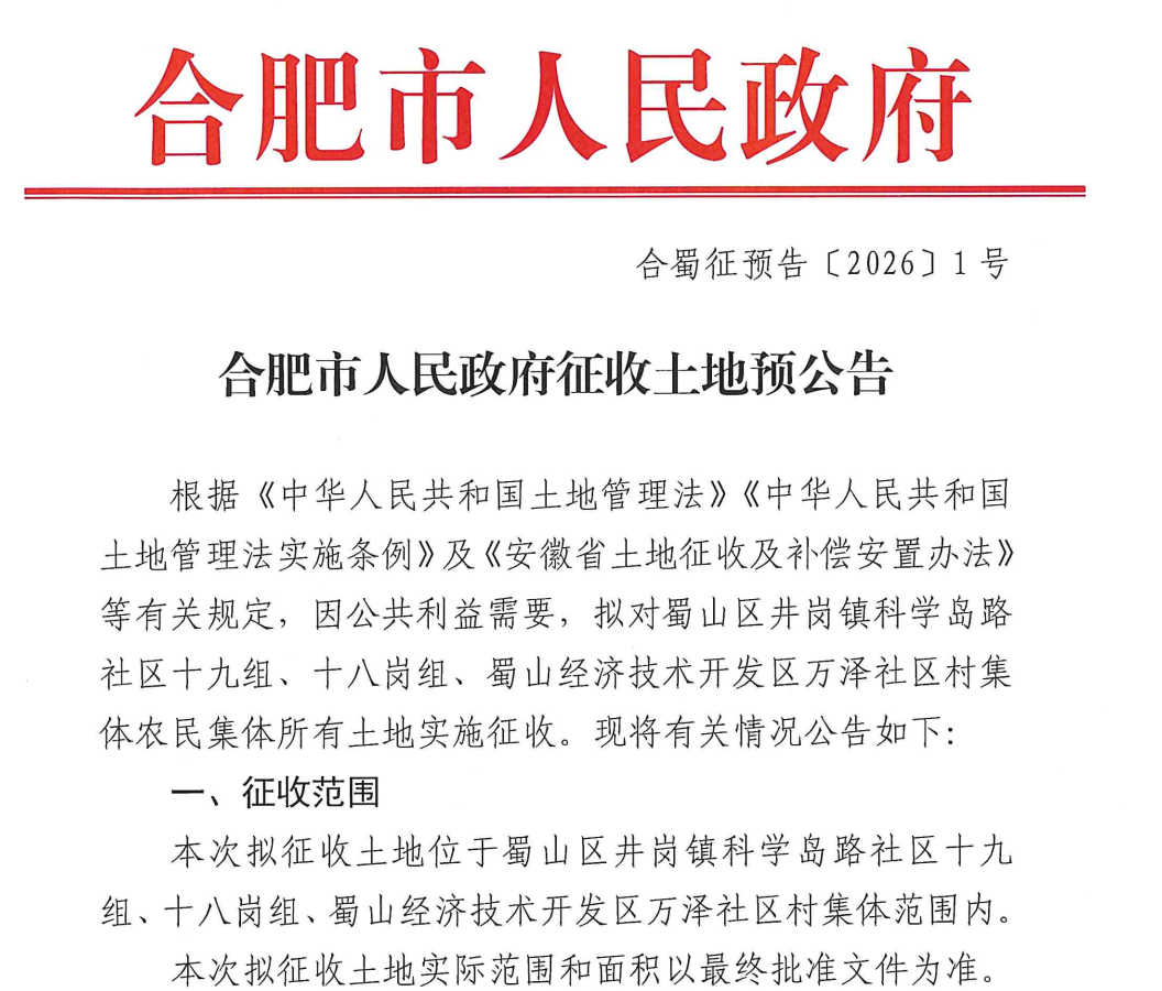 与此同时,蜀山区还发布蜀征预告〔2026〕1号公告,拟对蜀山区井岗镇科学岛路社区十九组、十八岗组、蜀山经济技术开发区万泽社区村集体农民集体所有土地实施征收。