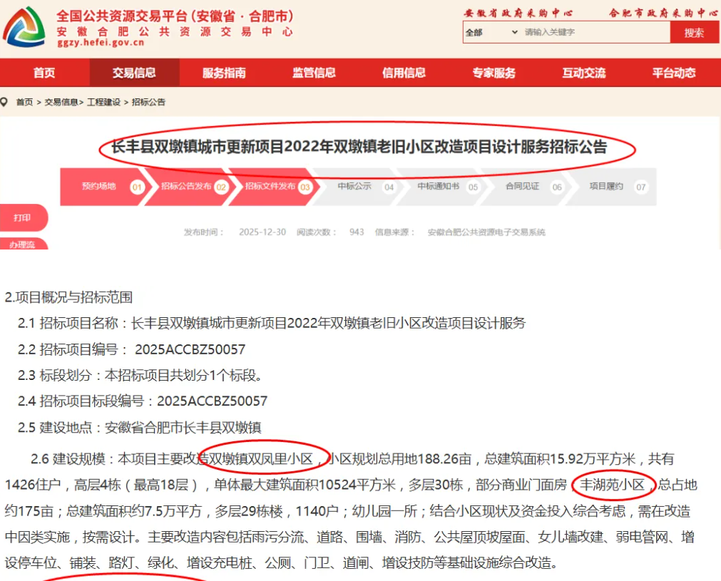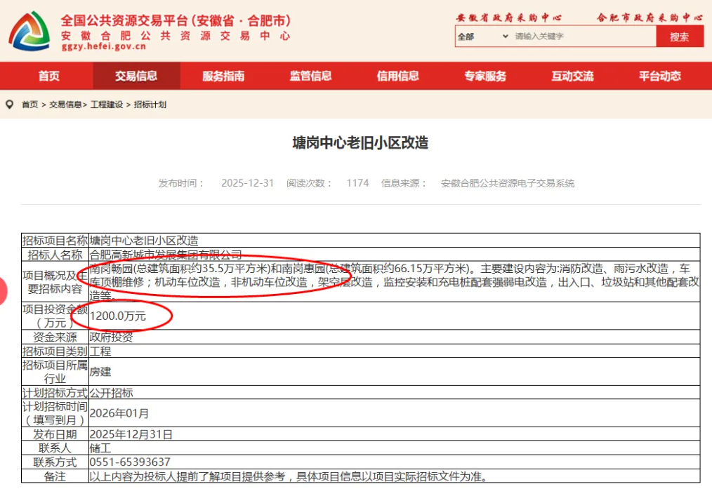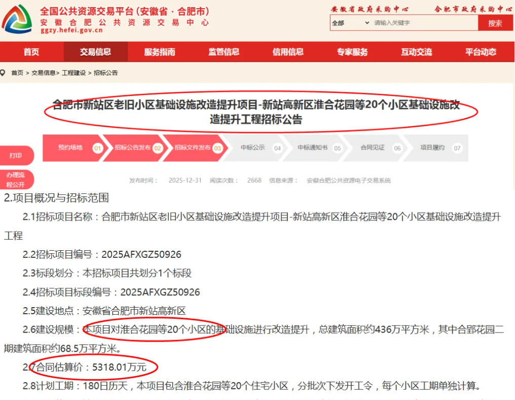 据合肥市公共资源交易中心网站的消息,2026年合肥首批次老旧小区改造工作已启动,共涉及24个小区,其中,新站区20个、蜀山区2个、长丰县2个,目前招标工作已经启动。