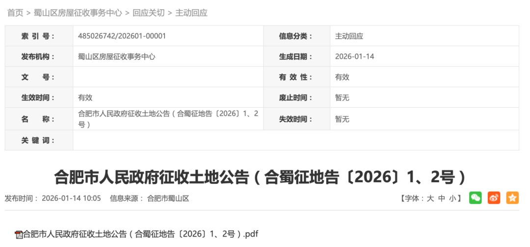近日,合肥市人民政府发布合蜀征地告〔2026〕1、2号征收土地公告。