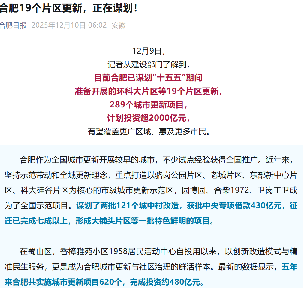据合肥建设部门消息,合肥已谋划“十五五”期间准备开展的环科大片区等19个片区更新,289个城市更新项目,计划投资超2000亿元,有望覆盖更广区域、惠及更多市民。
