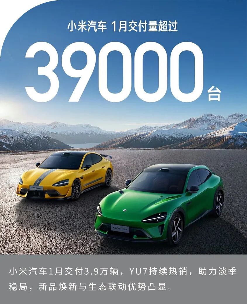 2月1日,小米汽车公布2026年首月交付数据:当月交付量达3.9万辆。