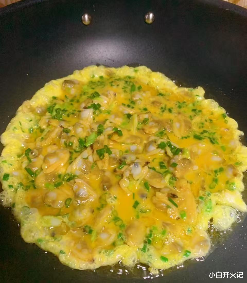 锅里倒油,比平时炒菜多那么一丢丢,油温五成热先下姜丝、葱白、红椒圈,“滋啦”一声,厨房瞬间有了深夜食堂的BGM。香味一冒头,立马倒入蛤蜊肉,大火快炒15秒,让海味和油香先打个招呼。接着把蛋液“哗”地淋下去,别急着翻动,等蛋液底部悄悄凝固、边缘泛起金黄小泡泡时,用铲子从外往里轻轻推,让未凝固的蛋液流到锅底,像给蛤蜊盖被子。重复两三次,鸡蛋刚刚全熟却还带着嫩滑光泽,撒葱花、点几滴香油,关火、装盘,全程不超过90秒。