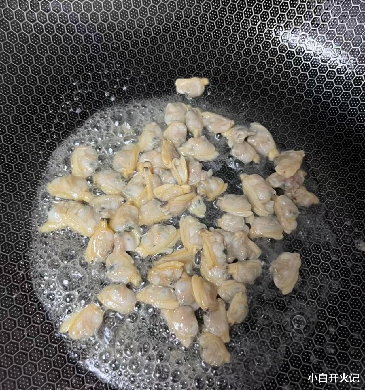 接着进入“快手备料”环节:鸡蛋打进碗里,加一小撮盐、半勺料酒、两滴白醋,筷子“哒哒哒”打成金黄小漩涡;香葱切葱花,葱白葱绿分家,姜切细丝,辣椒要不要?要!切半个小红椒,颜色瞬间喜庆。重点来了:蛤蜊得先“过一趟鬼门关”——烧一锅水,扔两片姜,水冒鱼眼泡时把蛤蜊倒进去,30秒就能听见“咔啦咔啦”的开门声,壳刚张嘴立刻捞出,过冷水,再用小勺把另一半壳掰掉,留下完整“蛤蜊肉小船”。别嫌麻烦,这一步是去腥锁鲜的“灵魂锁扣”,省不得。