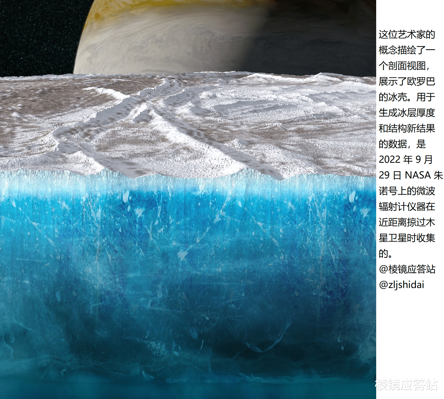 为研究木星大气层而设计的朱诺号搭载的微波辐射计(MWR),却意外成了解开木卫二冰壳之谜的关键工具,2022年9月29日,探测器在离木卫二表面就360公里的近距离飞过的时候,利用微波的穿透本事测量了冰层不同深度的温度分布,进而算出冰壳构造。