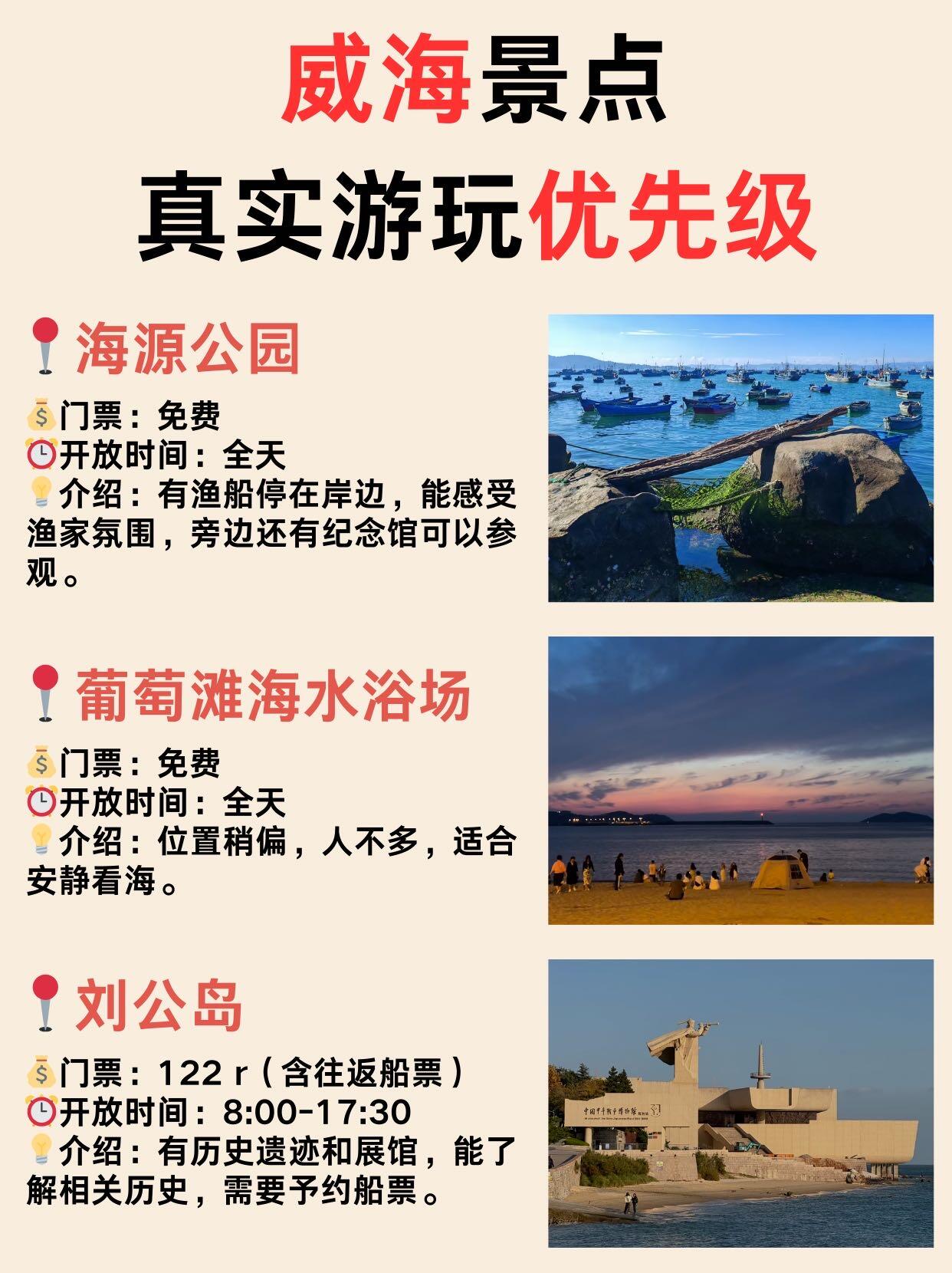 📅第三天葡萄滩有冰挂礁石,很闪。猫头山观景台雪天有雾气。海源公园退潮能捡贝壳。刘公岛的红墙覆雪很出片📸,博物馆人少清静。一天下来很好玩!