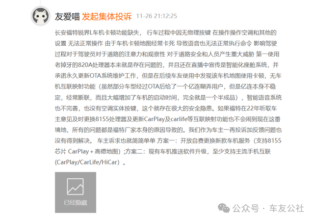 车主魏先生(化名)告诉车友公社,早在2022年,部分车主就已就处理器性能及互联功能问题向厂家反馈。若当时长安福特能及时响应,更换性能更优的8155处理器并完善互联功能,完全可以避免如今的维权风波。