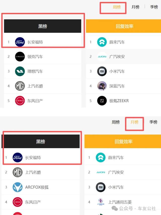 随着长安福特车主对于此集中问题的投诉维权,长安福特在黑猫等投诉平台的投诉量激增。在黑猫投诉平台上最新的汽车投诉周榜和月榜中,长安福特均为黑榜第一。