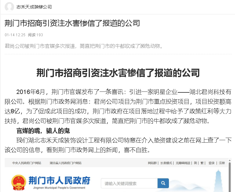 2016年6月,荆门市官媒发布了一条喜讯:引进一家明星企业——湖北君尚科技有限公司。根据荆门市政务网消息:君尚公司项目为荆门市重点投资项目,项目投资额高达8亿,为了促成此项目的成功,荆门市政府在项目落地过程中给予了政策红利等大力扶持,君尚公司被荆门市官媒多次报道,简直把荆门市的牛都吹成了濒危动物。