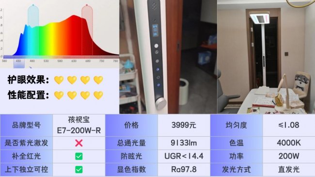 什么牌子的大路灯护眼好用又便宜?孩视宝E7-200W-R在光源上采用全光谱方案,并加入红光补偿,实测蓝光比例大约在0.6左右,整体光谱分布比较均衡,照明结构方面配备了接近1米的超长灯头,光照覆盖面积更广,可以满足较大空间的使用需求,功能上提供三档色温调节,能够根据阅读、书写或休闲场景进行切换,不过需要注意的是,这款灯的发光面温度相对偏高,同时光源的抗衰减表现比较一般。