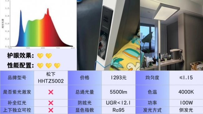 什么牌子的大路灯护眼好用又便宜?松下HHTZ5002采用三核全光谱芯片光源,在发光面结构上做了防眩处理,点亮后直视时的刺眼感有所减弱,操控方式上既支持本地语音控制,也保留了触控调节,平时使用会比较顺手,不过需要留意的是,虽然主打全光谱,但从光谱分布来看蓝光峰值还是偏高,红光补充相对不足,在自然光还原度以及长期护眼表现方面存在一定局限。