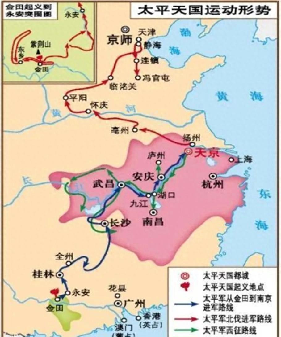 太平天国建立政权后,首先是贪图享乐,虽然也北伐了,但战略不明确,主攻方向不坚决,一部分(主力)由石达开向长江上游突破,一小部分(非主力)北上由林凤祥率领,孤军深入,打到天津被灭了,失败原因就是没有集中精力一鼓作气推翻清朝,没有把清庭推翻。