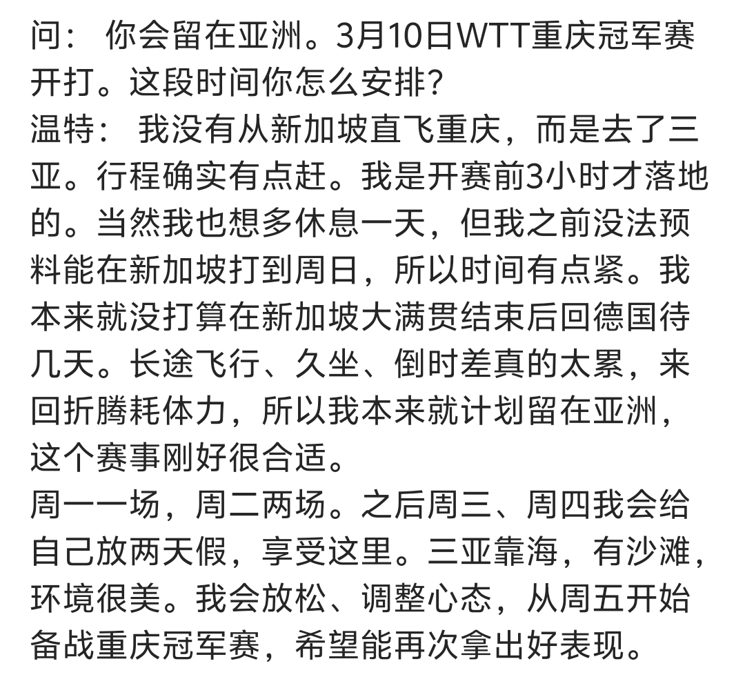 德国选手温特刚刚参加完了新加坡大满贯赛事,就去海口参加商业赛备战重庆冠军赛。温特在采访当中直接表示倒时差确实很累,久坐飞行来回折腾体力,所以就选择了留在亚洲进行训练和备战。所以现在的WTT赛事尽管赛程比较密集,但是对距离较远的选手确实是个备战的考验。