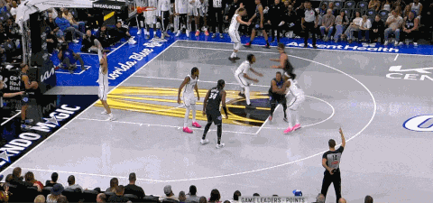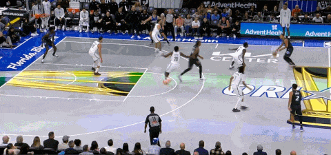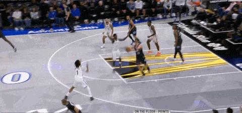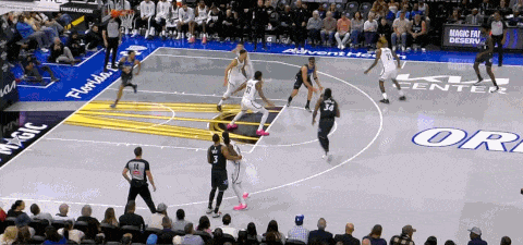 不过在第四节,魔术应对MPJ和克拉克斯顿+持球人的肘区三人配合也应对得不是很好,一度让篮网占据了主动,篮网的进攻思路是这样的:以double drag起手,但持球人迅速skip传球给克拉克斯顿,由德明/马丁/曼恩等人和MPJ完成背掩护或下掩护的配合,再围绕MPJ和克拉克斯顿打出配合: