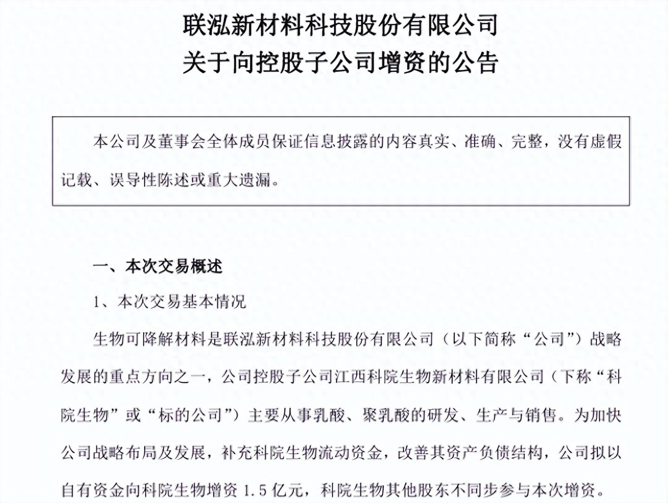 12月5日,联泓新科(证券代码:003022)发布公告称,公司拟以自有资金向公司控股子公司江西科院生物新材料有限公司(以下简称“科院生物”)增资1.5亿元,其中,8850万元计入注册资本,剩余6150万元计入资本公积。