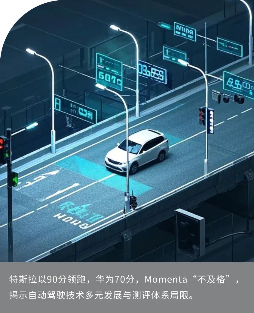 测试结果显示,特斯拉以90分领跑,华为获70分,Mobileye与Momenta均为50分左右,而现代自研的Atria AI仅得25分。