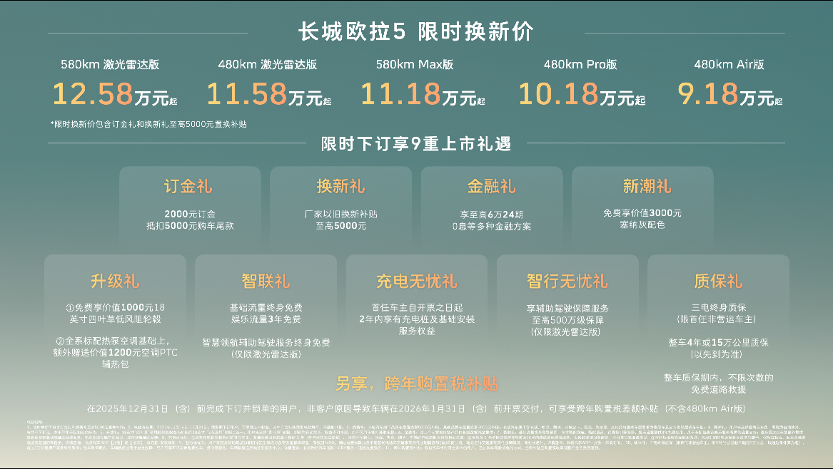【中国·保定】2025年12月16日——今日,长城汽车欧拉品牌全新A级纯电SUV——长城欧拉5正式上市。新车共推出5款配置,建议零售价区间为 9.98万至13.38万元,限时换新价9.18万元起(限时换新价包含“订金礼”和“换新礼”至高5000元以旧换新补贴)。为回馈广大用户的热爱与支持,即日起至2025年12月31日,用户下订并锁单即可尊享包含订金礼、换新礼、智行无忧礼在内的9重上市好礼,以及跨年购置税补贴(不含480km Air版)等丰厚购车权益。凭借诚意十足的价格权益与越级产品力,长城欧拉5致力于成为全球年轻用户的“严选搭子”。