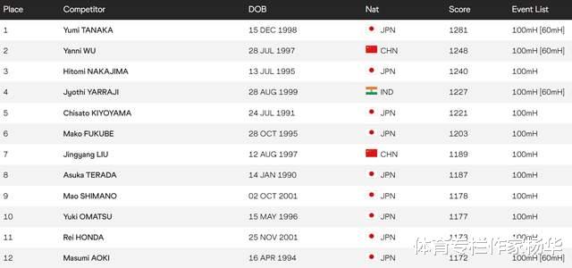 世界田联公布女子100米栏最新世界排名,新科全运会冠军刘景扬世界排名第78,亚洲排名第七;连续两届全运会亚军吴艳妮世界排名第33,亚洲排名第二。而林雨薇、夏思凝等名将世界排名分列138和286位。