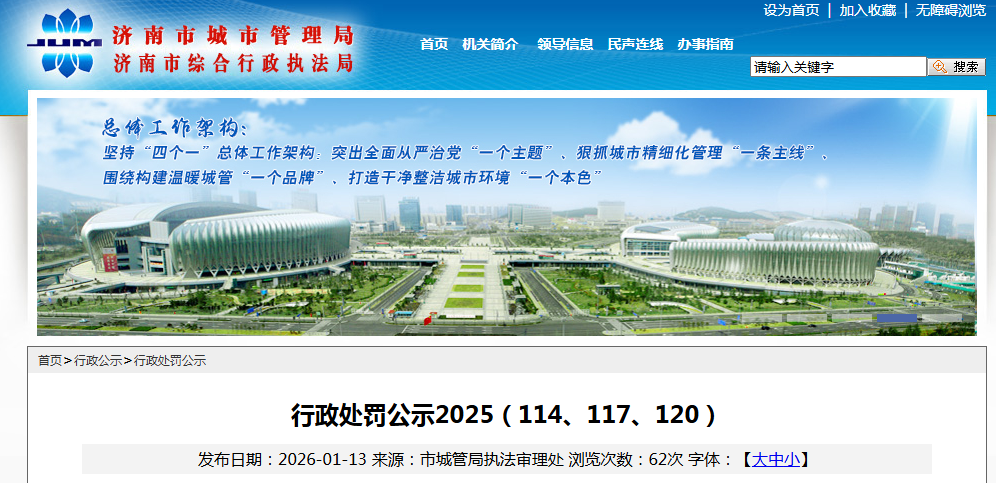 据济综执处字(2025)第120号:2025年11月3日,济南东能建设工程有限公司在历城区工业北路与济南绕城高速交叉口以西施工的济南市工业北路快速路东延道路建设工程一工区项目,存在未按照要求采取扬尘污染防治措施的行为。济南市城管局(济南市综合行政执法局)对济南东能建设工程有限公司处以罚款2万元。