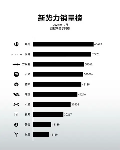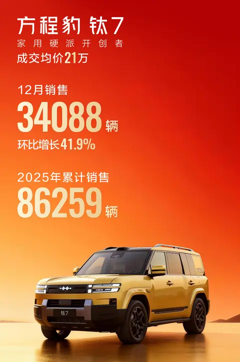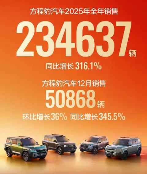 方程豹2025年收官真是完美,12月月销50868台,上到了5万台的规模,2025全年234637辆,比增长36%,同比增长345.5%。品牌累销296737辆。因为小米汽车的官宣只说只说12月销量5万+,没有具体的数字,对比小米在11月销量是46249台,同样是通过增长达成的5万辆月销规模,两个品牌不知道两者谁高,所以方程豹在新势力就是第三或者第四的位置,比蔚小理高,也期待小米的实际销量成绩。