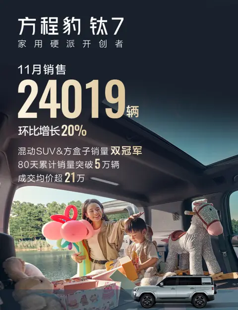 今年2月份过年时间,所以1月份会有更多人有赶着提新车回家过年需求,钛7这样的比较有话题的车,硬派越野设计,中大型大五座SUV,好看又比较能装,还是20万价位少有的双叉臂底盘方盒子插混SUV,多种Buff叠加,不知道1月份销量得去到多少……