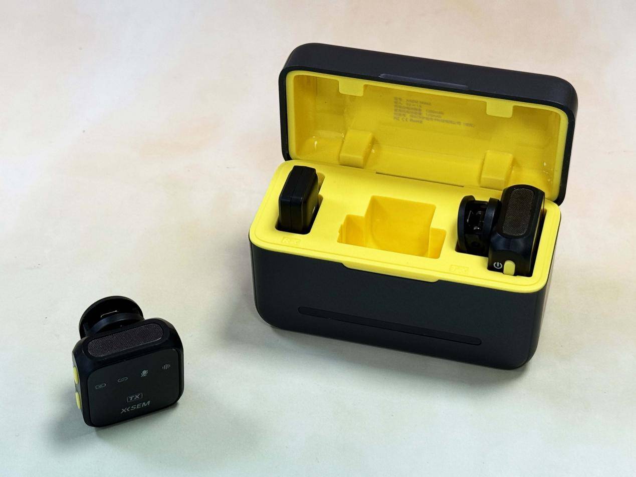 猛玛LARK M2采用一拖二的标准配置,包含两个发射器、一个接收器以及充电收纳盒,整体设计兼顾便携性与实用性,发射器体积小巧,配备背夹式设计,可稳固附着于衣物领口等位置,便于隐藏拍摄;麦克风没有显示屏,不支持显示连接状态、电量、音量等关键参数。