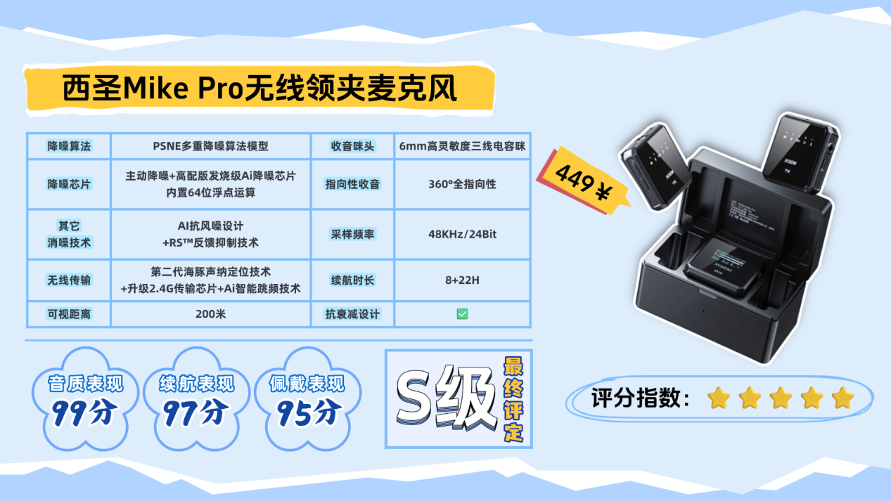 售价保持不到200元,甚至大促期间优惠一减再减,当前定价不到169元的西圣Mike2拥有媲美千元级别麦克风的音质和降噪体验,附赠转接头广泛兼容设备,这是彻底颠覆了百元麦克风的市场格局,这样极具性价比的专业无线麦克风,完全没有不推荐的理由!