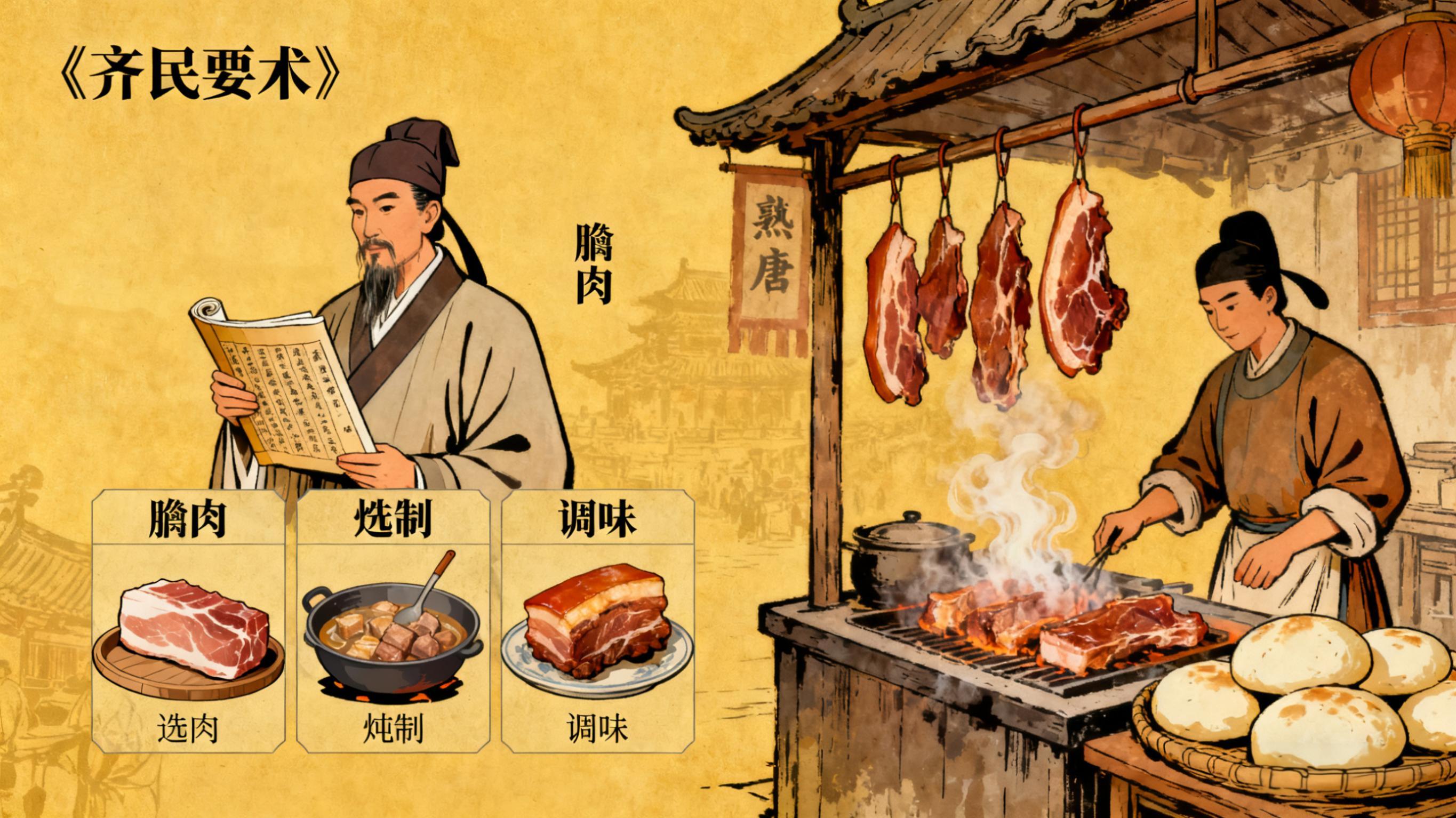公元前230年秦灭韩,这门炖肉手艺随流民传入长安,在关中大地落地生根。到了北魏,农学家贾思勰在《齐民要术》中记载了“膪肉”的制法,选肉、炖制、调味的手法与今日腊汁肉已基本无异,只是如今的用料更讲究,老汤的传承也更具章法 。而真正让肉与馍相遇,让这道美食有了雏形的,是盛唐的市井繁华。